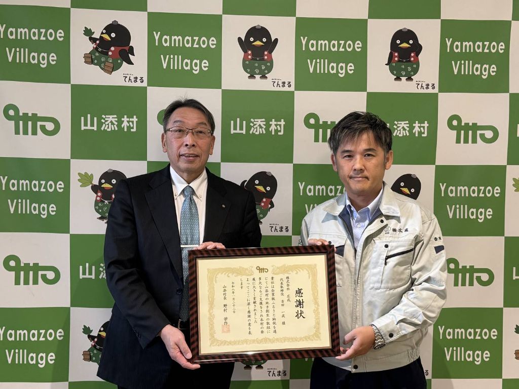 令和6年11月12日、代表取締役の田畑日出男様に感謝状を贈呈しました。