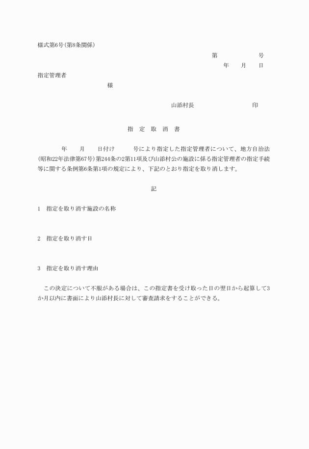 第6条 村長は、指定管理者を指定したときは、様式第3号により指定管理者指定通知書を交付する。